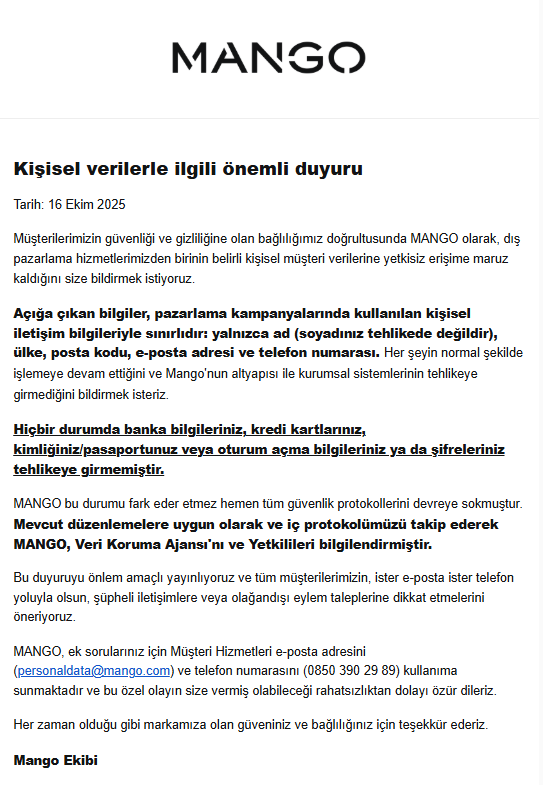 Açığa çıkan bilgiler, pazarlama kampanyalarında kullanılan kişisel iletişim bilgileriyle sınırlıdır: yalnızca ad (soyadınız tehlikede değildir), ülke, posta kodu, e-posta adresi ve telefon numarası. Her şeyin normal şekilde işlemeye devam ettiğini ve Mango’nun altyapısı ile kurumsal sistemlerinin tehlikeye girmediğini bildirmek isteriz.